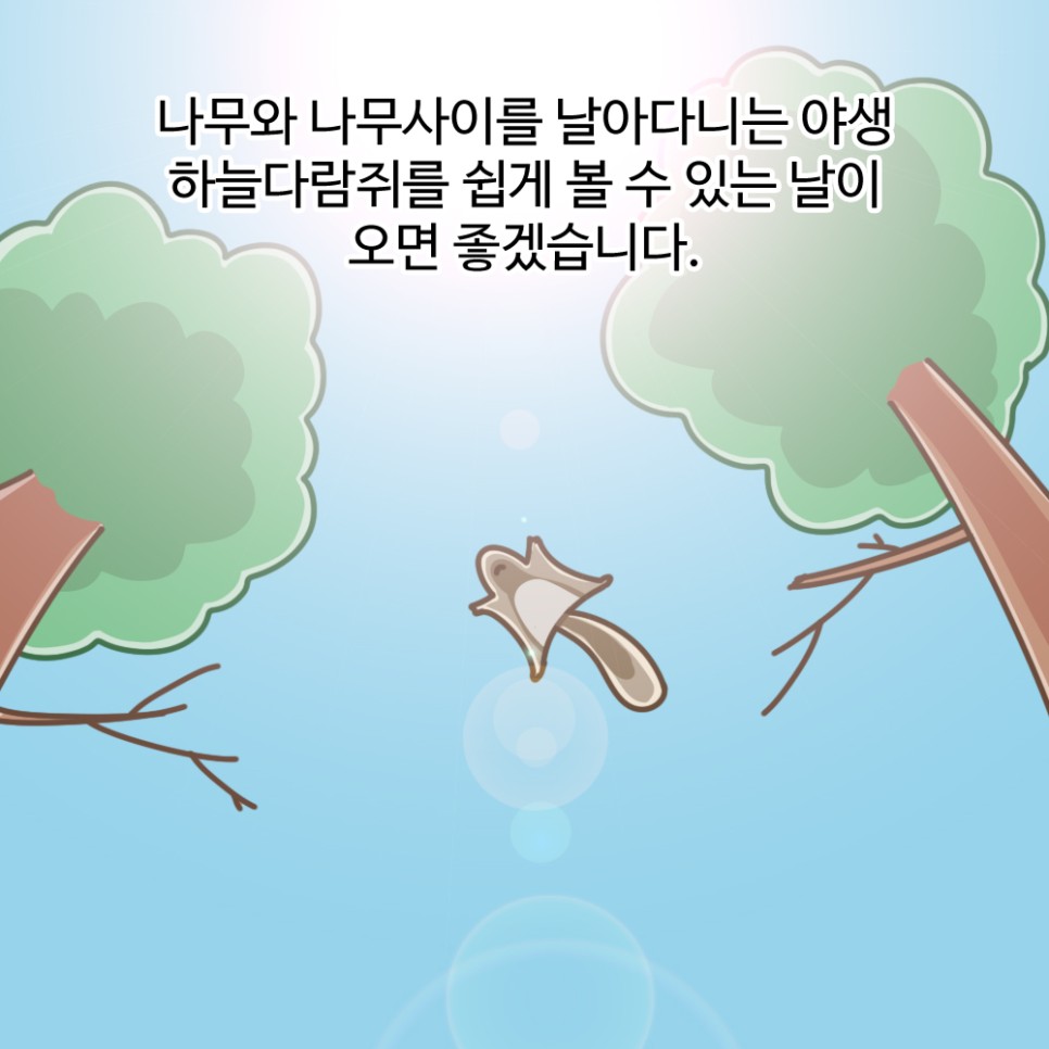 나무와 나무사이를 날아다니는 야생 하늘다람쥐를 쉽게 볼 수 있는 날이 오면 좋겠습니다.