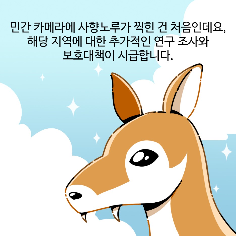 민간 카메라에 사향노루가 찍힌 건 처음인데요, 해당 지역에 대한 추가적인 연구 조사와 보호대책이 시급합니다.