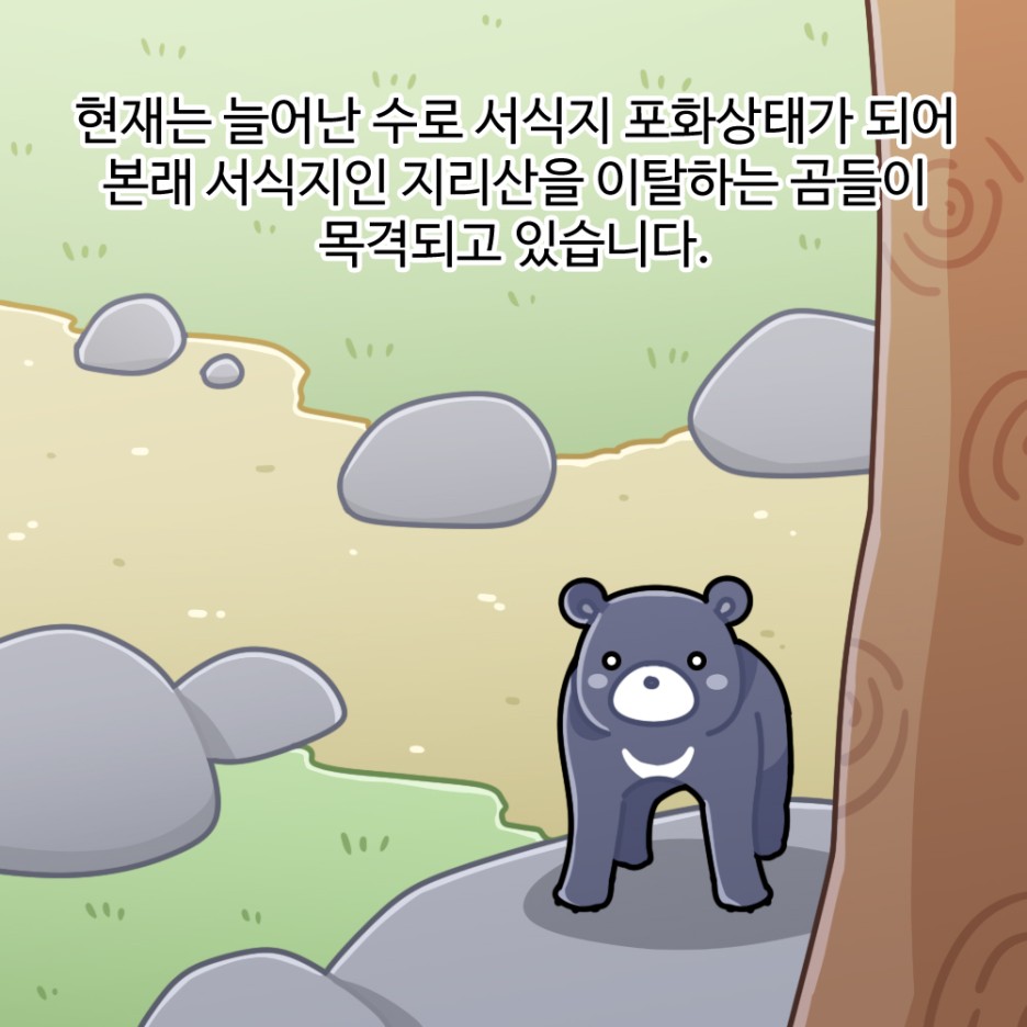 현재는 늘어난 수로 서식지 포화상태가 되어 본래 서식지인 지리산을 이탈하는 곰들이 목격되고 있습니다.
