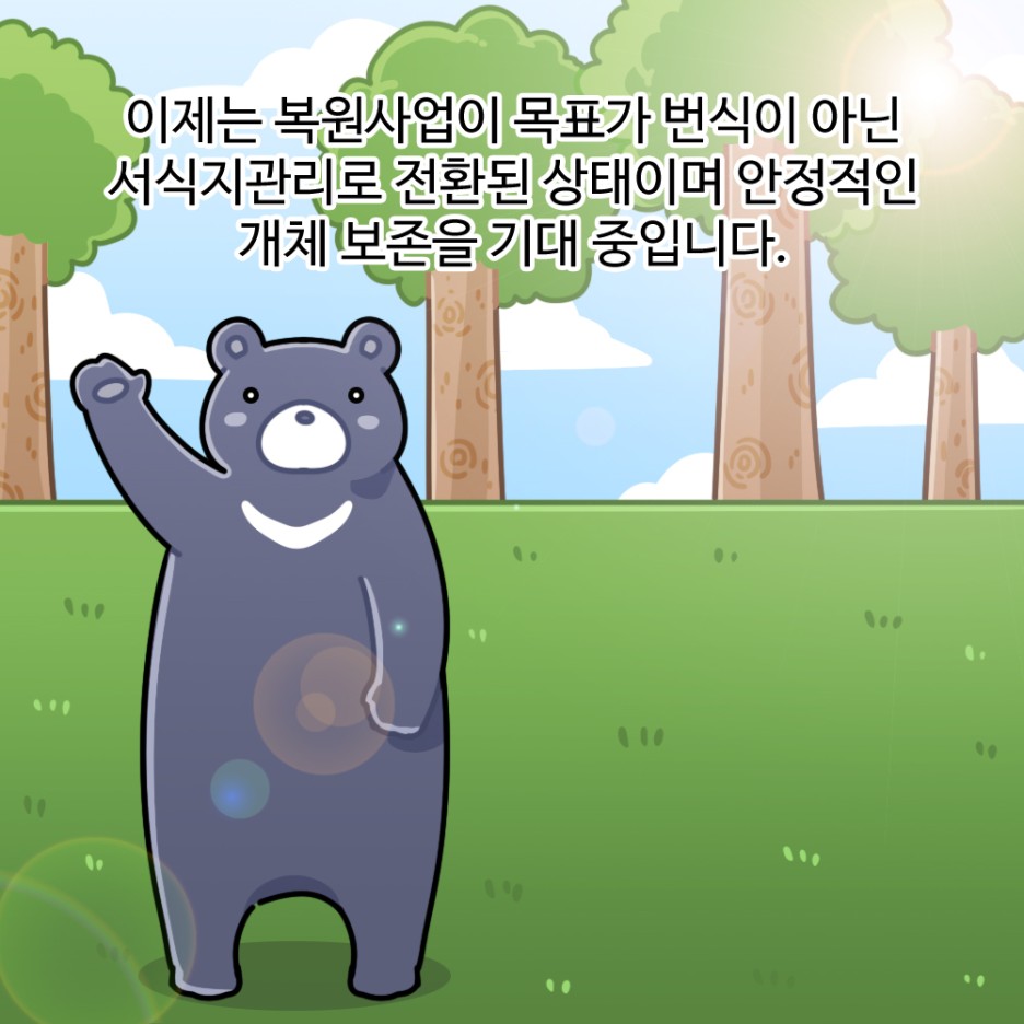 이제는 복원사업이 목표가 번식이 아닌 서식지관리로 전환된 상태이며 안정적인 개체 보존을 기대 중입니다.