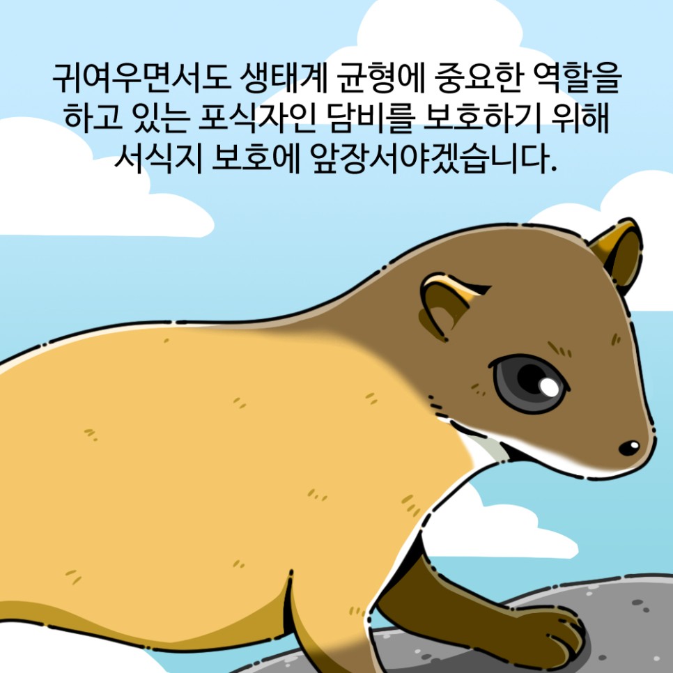 귀여우면서도 생태계 균형에 중요한 역할을 하고 있는 포식자인 담비를 보호하기 위해 서식지 보호에 앞장서야겠습니다.