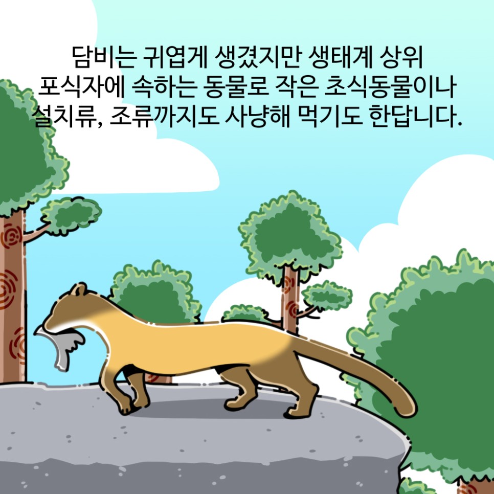 담비는 귀엽게 생겼지만 생태계 상위 포식자에 속하는 동물로 작은 초식동물이나 설치류, 조류까지도 사냥해 먹기도 한답니다.
