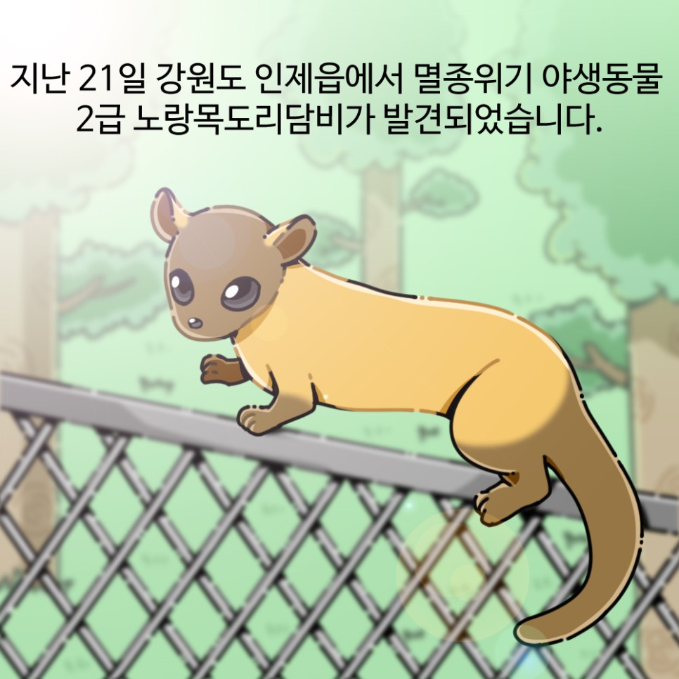 지난 21일 강원도 인제읍에서 멸종위기 야생동물 2급 노랑목도리담비가 발견되었습니다.