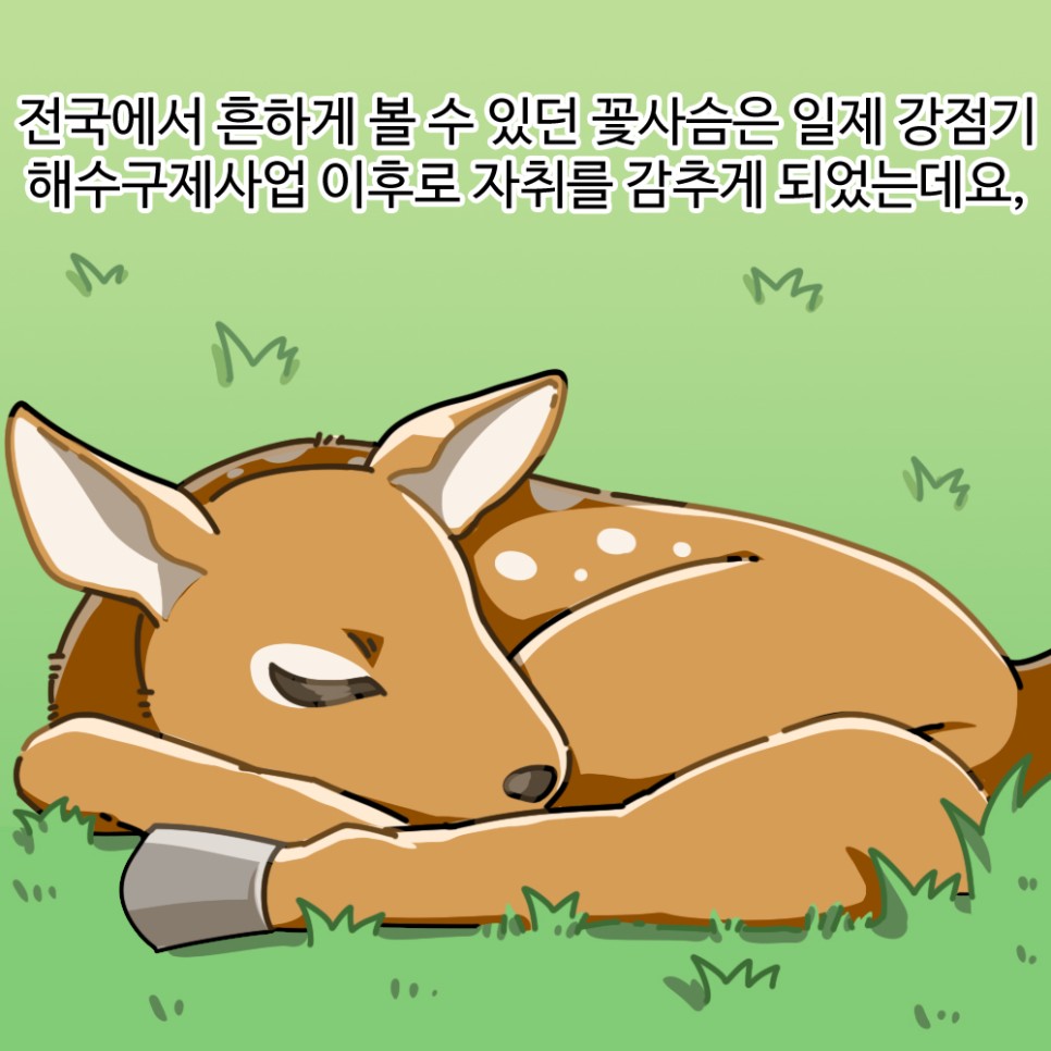 전국에서 흔하게 볼 수 있던 꽃사슴은 일제 강점기 해수 구제사업 이후로 자취를 감추게 되었는데요.