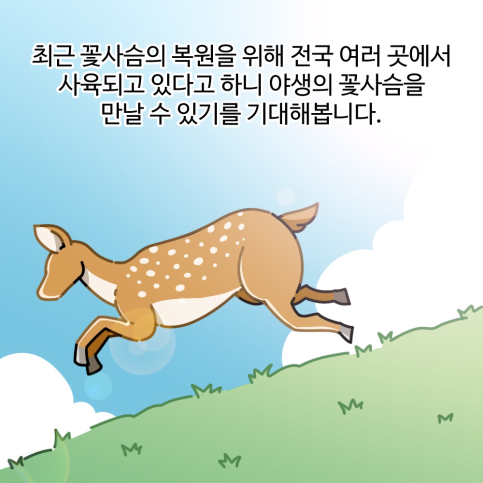 최근 꽃사슴의 복원을 위해 전국 여러 곳에서 사육되고 있다고 하니 야생의 꽃사슴을 만날 수 있기를 기대해봅니다.